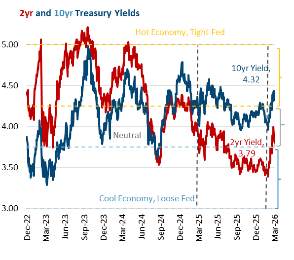 Comparing economic and Federal Reserve expectations to levels currently implied by interest rates remains the best way to frame these types of debates. Our “market expectations” model compares current market interest rates relative to the embedded Fed and economic expectations. Assuming 2% inflation and 2% trend growth, we get a 4% neutral interest rate, bracketed by a 50 bps 3.75% to 4.25% neutral range. Chart 1 above shows the 2yr (Fed policy) and 10yr (economy), as well as orange “Hot Economy, Tight Fed” and a blue “Cool Economy, Loose Fed” ranges. The 10yr has moved 40 bps higher (from 3.95% on 2/27 to as high as 4.44%) in response to rising inflation expectations, while shifting Fed expectations are evident in the 2yr jumping from 3.39% to 3.79%. With the current Fed Funds target of 3.50%, that means the market went from pricing additional rate cuts (3.39% is less than the Fed’s current 3.50% target), to pricing rate increases in the coming two years.