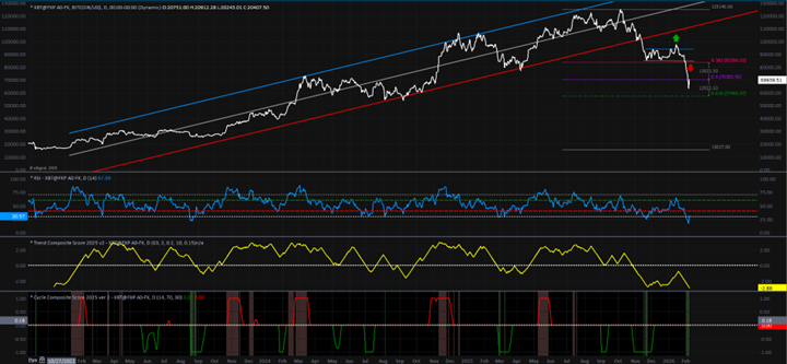 - Retracement Ratios: bitcoin has retraced over 50% of the advance from early 2023 to October 2025. Ratio analysis suggests support at 57,460 which is a 61.8% retracement