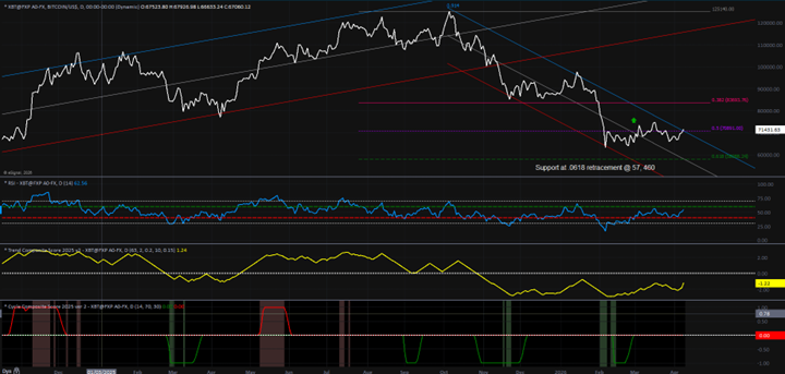 - Retracement Ratios: Bitcoin has retraced over 50% of the advance from early 2023 to October 2025. Ratio analysis suggests support at 57,460 which is a 61.8% retracement